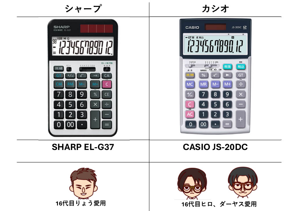 シャープかカシオの違いはキーの配列や機能が若干が異なるため、人によって好みが分かれます。とはいえ、使っていれば慣れるので、初学者や購入を迷っている方は見た目とフィーリングで決めても構わないと思います。以下に16代目メンバーが使用していたおすすめ電卓を紹介します。