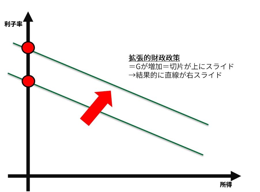 拡張的財政政策=政府支出Gが増加→切片が上に来る=IS曲線は右スライド