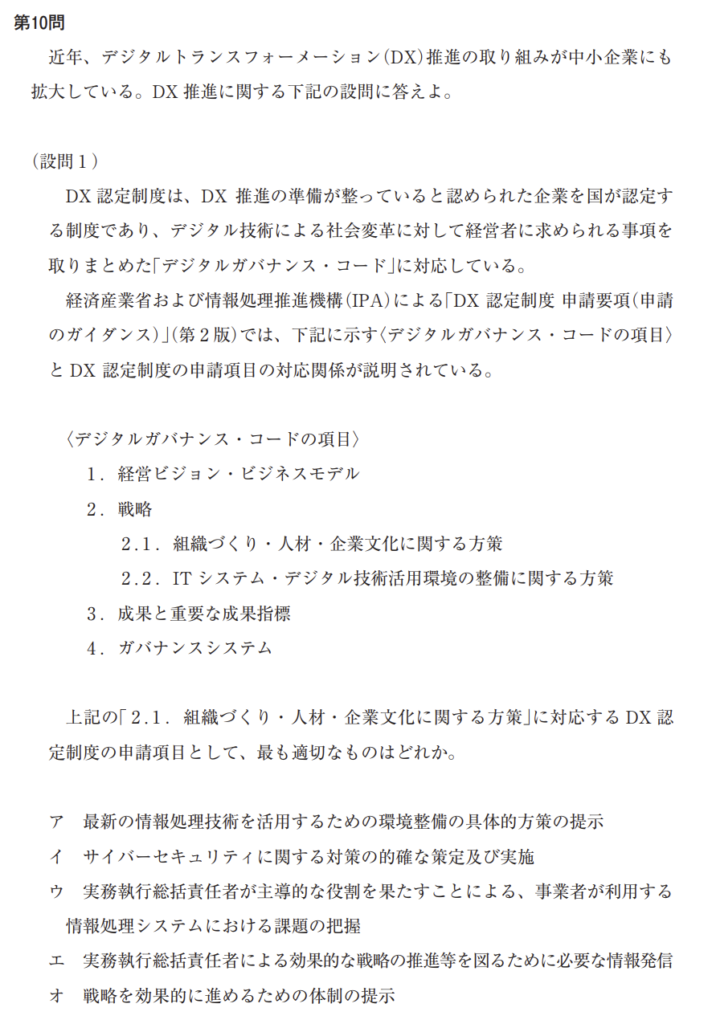 昨年のR6試験の第10問の設問一、二の2問において、IPA(独立行政法人情報処理推進機構)や経産省が出した文書をテーマにした問題が出題され、中小企業のDX推進に関して問われました。このような行政文書をテーマとした出題はR2以降の直近5年、R5再試験も含めて6回の試験では初の出題となりました。前々回の記事でも掘り下げたDXですが、中小企業の成長を促していくためにはやはり極めて重要なテーマであり、中小企業庁が中小企業診断士の役割の一つとして「中小企業と行政・金融機関等を繋ぐパイプ役」ということを提示していることから、DXに関する行政文書からの出題は今年もあって然るべきではないか、と思っています。