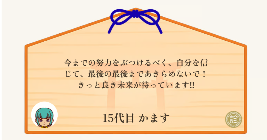 どの内容も心のこもった内容ばかりで、16代目一同、拝見していて身の引き締まる想いでした。ご投稿いただいたみなさまのハンドルネームを、私たちの念を込めて絵馬に記し、奉納してきました!