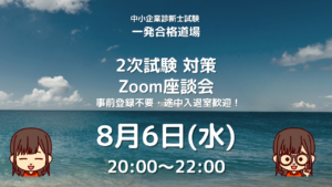 さらに、8月6日(水)の記事を公開した夜20時から道場メンバー数名でゆるっと内容を振り返るZoom座談会を開催します!2次試験の概要を知る時間として3日間のブログ内容と+αをお伝えします。参加申込は不要かつ入退出自由なのでぜひお気軽にご参加ください(URLは明日の記事でお知らせします)♪