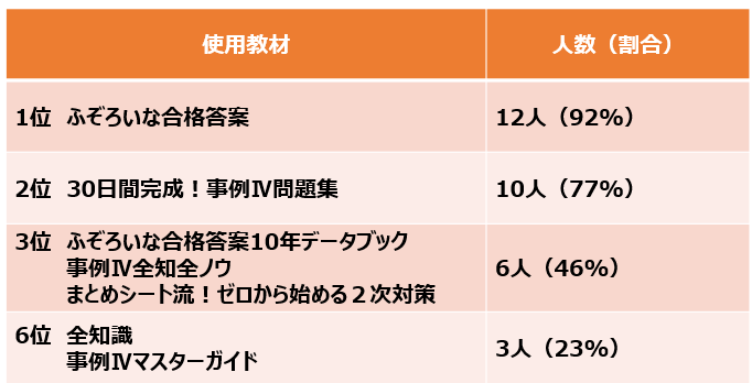 なお、事例Ⅳは苦手意識が強い人も多く、事例Ⅳに特化した教材を投入している人が圧倒的多数です。この後もいくつか出てきますのでご自身のレベルや求めるものに応じて選んでみてください。なお、2次試験の最終科目で体力的にもキツイなか解く事例Ⅳはなかなかの破壊力を有します、はい。手は疲れているし、頭も疲れて残念ながらミスをしやすい環境がきれいに整っています。ですので、いかに基礎が出来ているかが勝負の分かれ目と個人的には思っています。それもあってか、合格者からは1次試験終了直後から毎日事例Ⅳに関する何かには触れるようにしていたとの体験談もよく耳にします。
