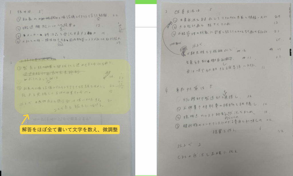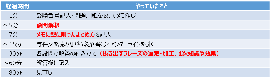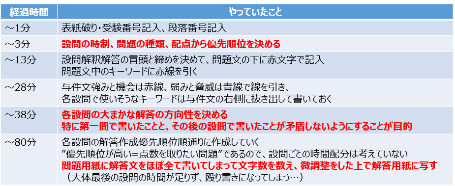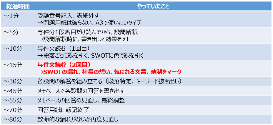 ぼくはこれに加えて①最初に見直しリストを作成、②設問を読む前に全体の分量を確認、そして③マーカーを最大10本使ってSWOT分析や設問ごとの切り分けを行っていたよ!