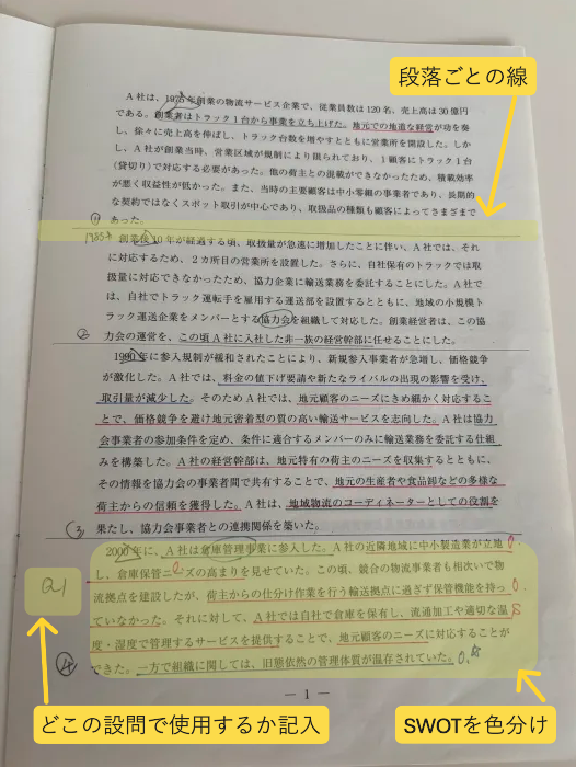 設問にはさらっと線を引く程度だったかな。与件文から設問に合ったキーワードや文章を拾ってくることに注力していたよ~!