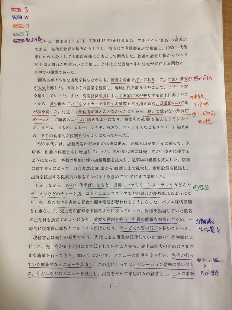 与件文を読みながら、「強み・弱み・機会・脅威」などに色分け・記号分けしてマーキング。