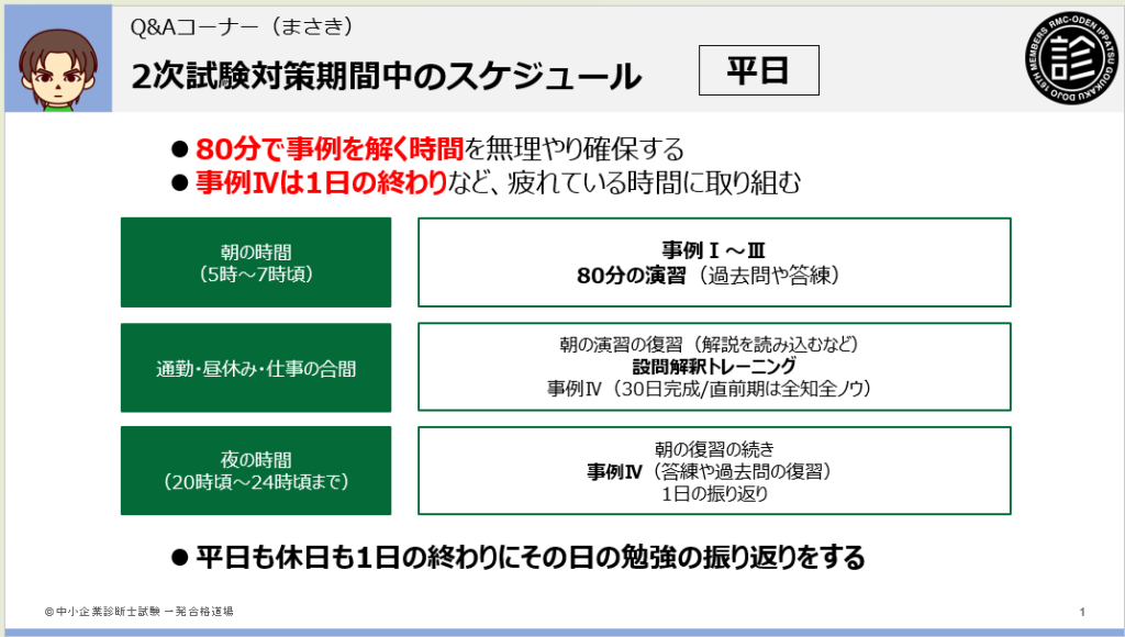 ちなみに、特に朝でなければいけない理由(例:子供がいる等)がないなら、夜型でも良い気がします。人によっては、仕事で疲れ切った状態で事例Ⅳを解くという本番想定の訓練をしている方もいますので。自分の生活や集中力のピークに合わせた時間帯を選ぶことが大切かな、と思っています。