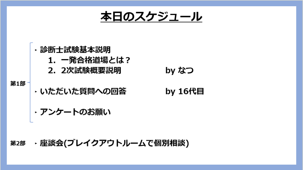 本日は「負けられないなつ!2次試験対策!」の第2弾質問受付編の回答や第3弾Zoom相談会の模様をお伝えします。参加できなかったみなさまもぜひ参考になる点を見つけてもらえれば嬉しいです♪