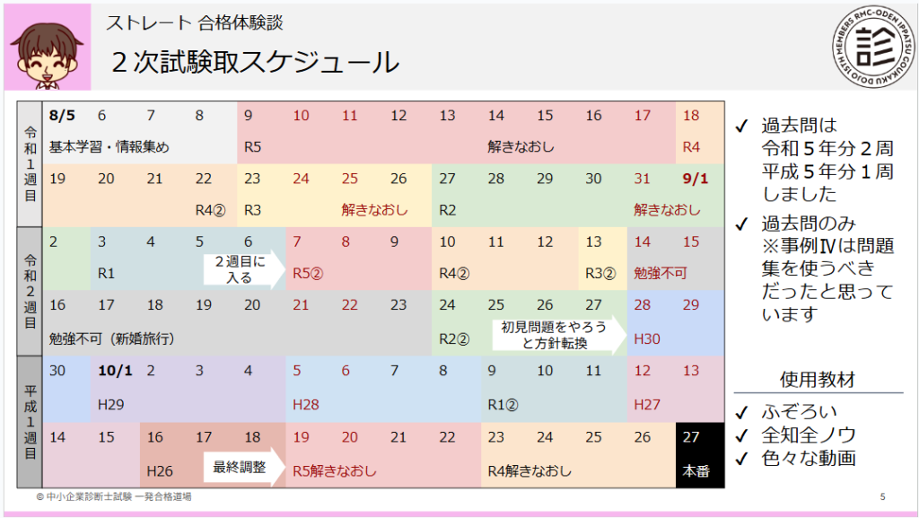 1次試験が終わった後から2次試験対策をした僕の月間スケジュールはこんな感じだよ!ただ、過去問演習を詰め込み過ぎたなぁ。今考えると、もっと復習に時間をかけた学習計画にすべきだったと思うよ。
