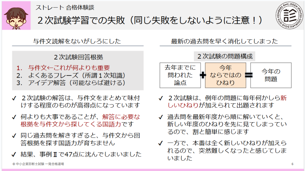 2.与件文の読み方不足:過去問解いていると知ってても得点要素を抜き出せなかったことによく出くわします。そんなとき、「あー今回はたまたま抜き出せなかったんだなぁ」と思わずに、なぜ抜き出せなかったのか、どのようにしたら抜き出せるようになるのか、徹底的に考え抜き、いろいろな方法を試していきましょう。