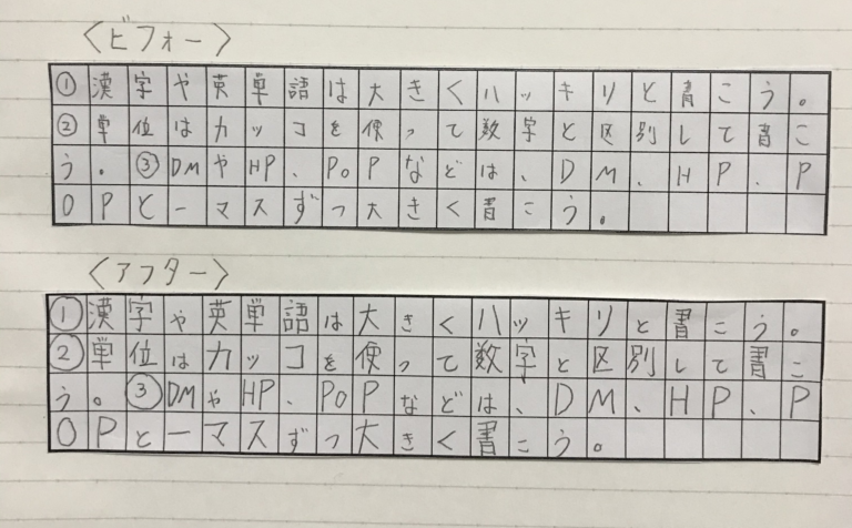 ① 漢字や英単語は大きくハッキリと書こう。