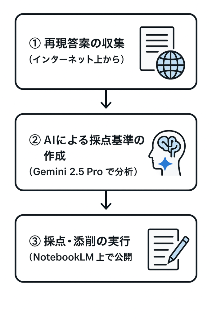 - アプローチ1: AIが模範解答を作成AIが問題を解く → [完璧な模範解答] → 採点基準化 → 添削(メリット: 高速 / デメリット: 現実の合格レベルと乖離)