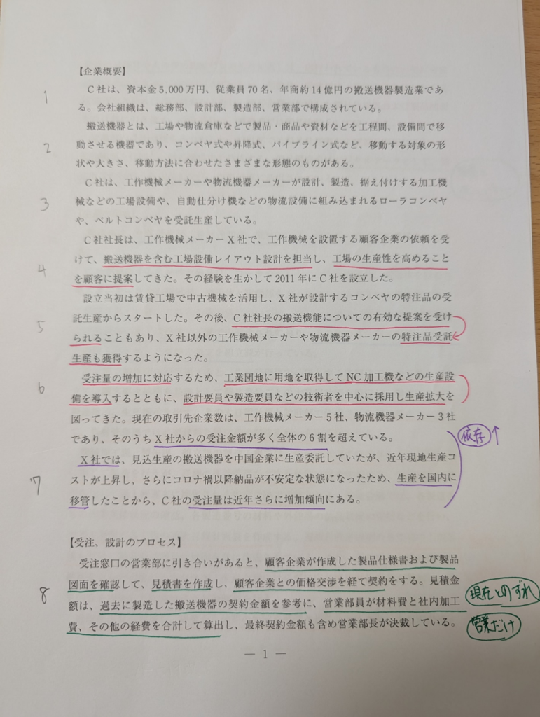事例企業の状況を与件文から読み解き、全体の方向性、強み、課題を明確にしていく。