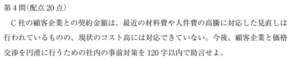 一方で、自社の強みの見える化や付加価値向上による価格転嫁は高得点答案に多い要素ですが、与件文に根拠がないため優先度は低めです。