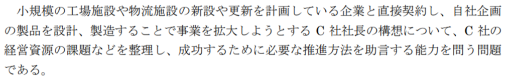 提案力の活用も営業力強化もなく、解答は「①マーケットのニーズを把握したうえでX社等の顧客企業向け特注品とは差別化を図ること」「②製造品質及び生産統制の水準を維持すべくノウハウをマニュアル化・標準化し契約先にも浸透させるべき」となっています。