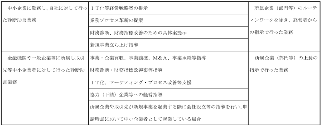 「経営者からの依頼・指示」などの条件はありますが、中小企業庁の資料では「新規事業立ち上げ指導」等も実務従事の対象として明記されています。