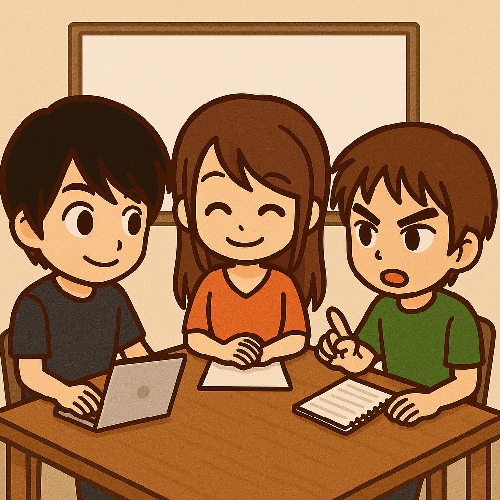 今回の道場模試作成は、かえる、さくら、まさきの3人で進めていました。