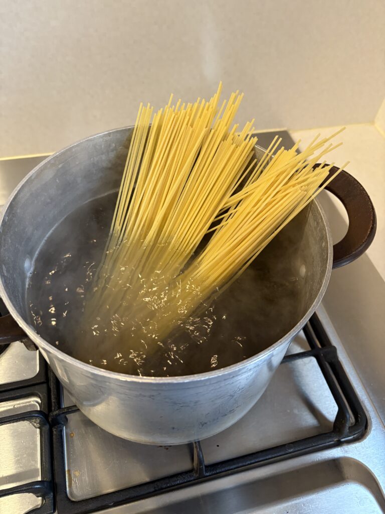僕は麺をゆがきだしてからソースを作っていますが、慣れていないなら先にソースを作ってから麺を茹でましょう。
