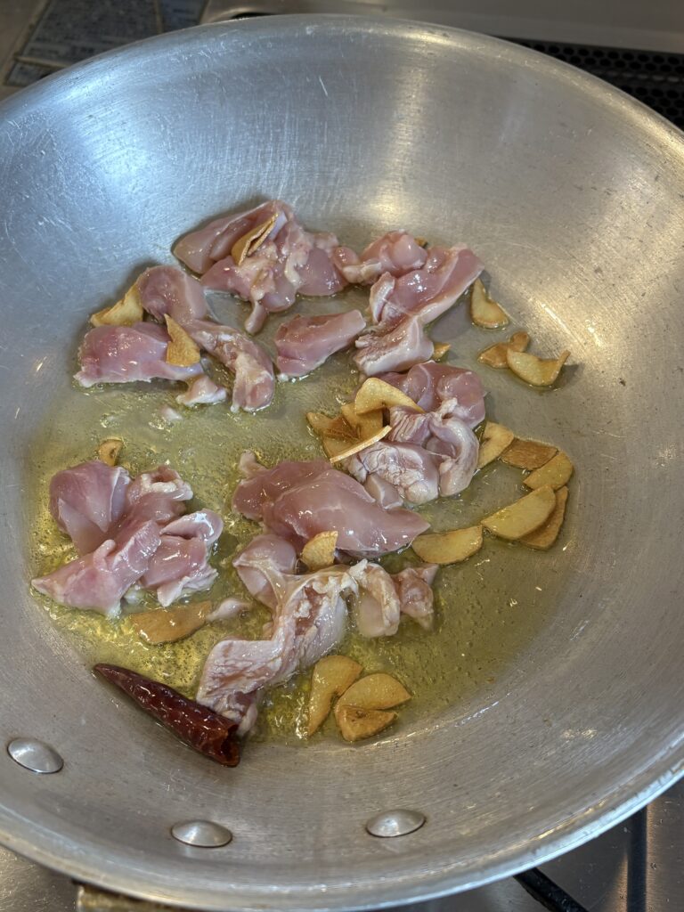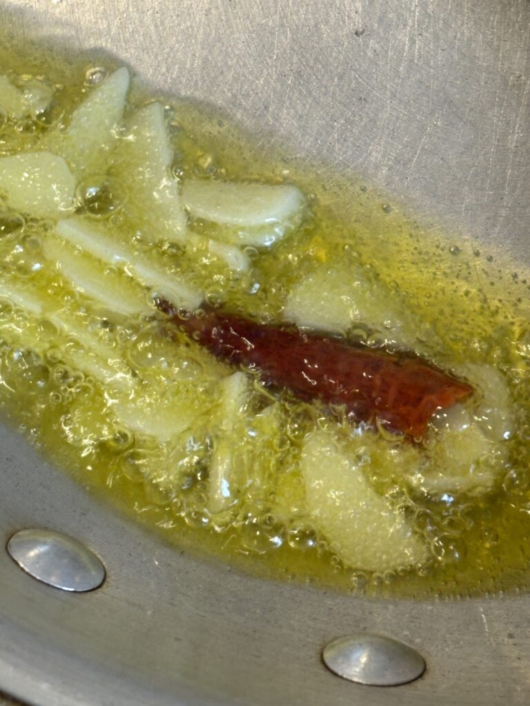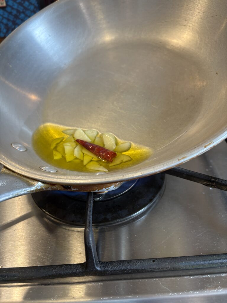 まずフライパンににんにくと鷹の爪とオリーブオイルを入れます。