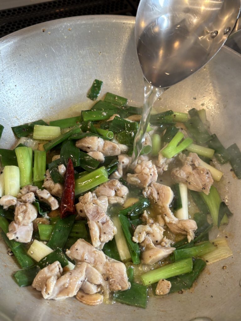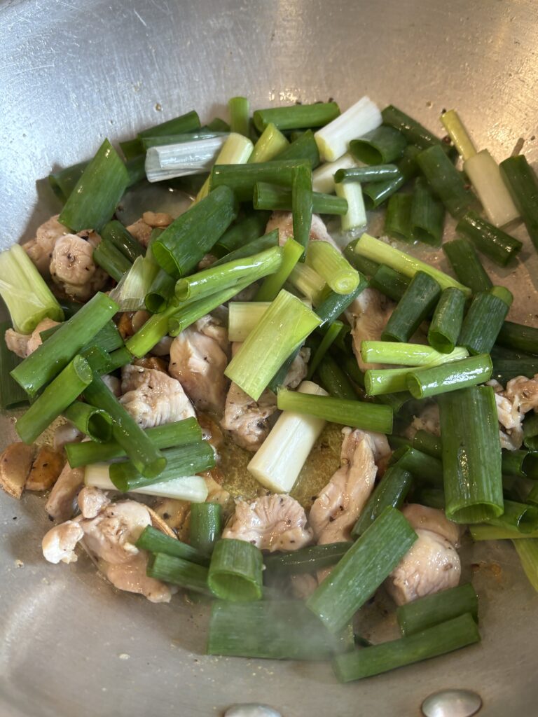 ここで火加減を少し強めにして青ネギに火を入れます。
