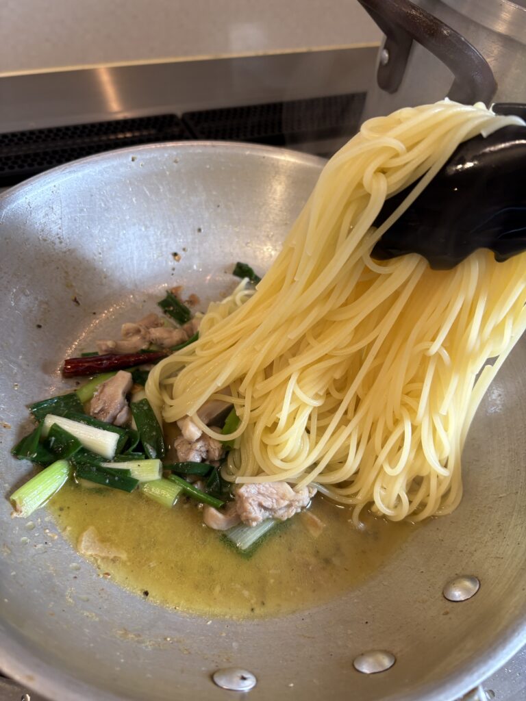 鶏肉と青ネギの旨みがオリーブオイルに溶け込んで、パスタに絡んで・・・