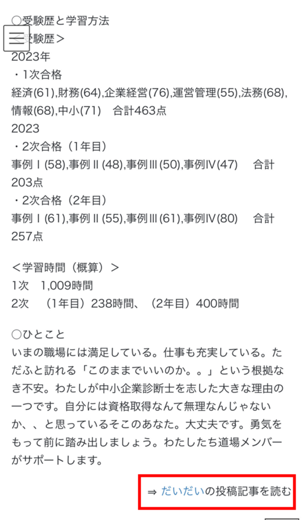 合格者が診断士を目指したきっかけ、受験回数、保有資格、勉強方法、勉強時間などを紹介しているので、自分と近しい境遇の人を見つけると参考になるね!