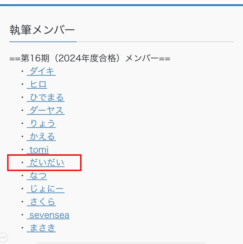 下にスクロールしていくと、各代執筆メンバーの個人ページを見ることができます。