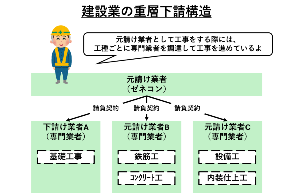そのため、元請業者(ゼネコン)を頂点とし、一次下請、二次下請、三次下請……と続くピラミッド型の「重層下請構造」となります。