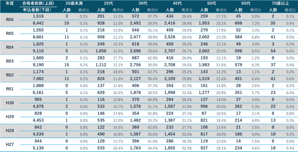 - この2つの年代は、過去10年間(H27~R06)を通じて一貫して20%以上の高い合格率をキープしています。