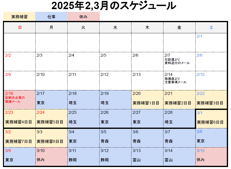 赤背景は休み、青背景は本業、オレンジ背景が実務補習です。