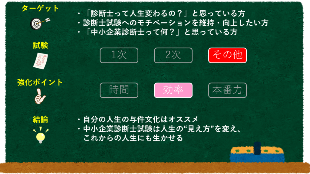 しかし、多くの方が長期戦となる診断士試験で、将来像を描きながら挑むことでモチベーションが向上し、効率的に取り組めるようになる可能性はあると思っています。