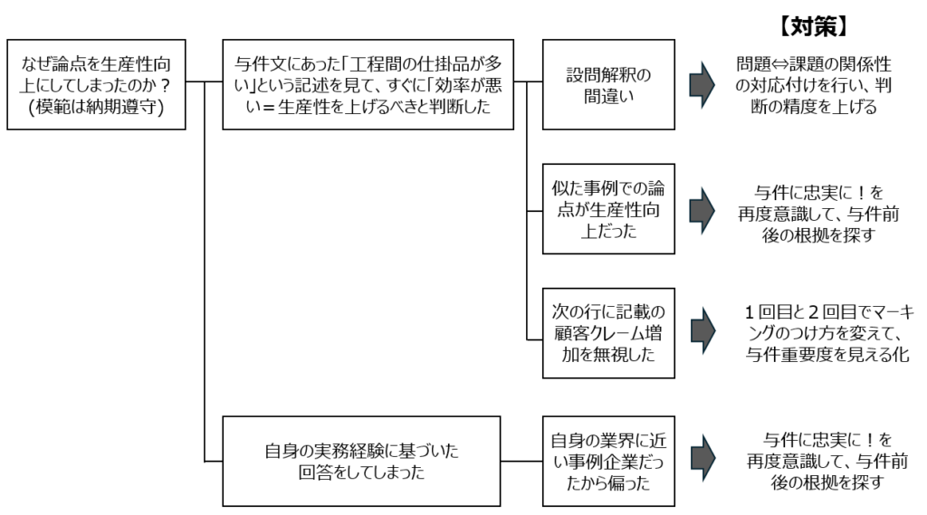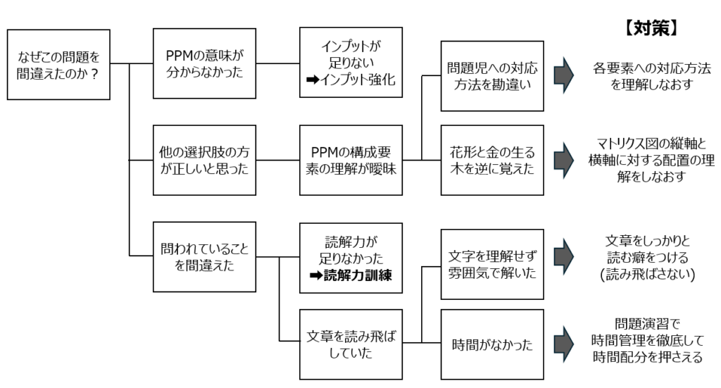 中小企業診断士試験での間違いにおいてもこの「なぜなぜ分析」を行うことで、自分の間違いに気付いたり思考の癖を知ることができます。