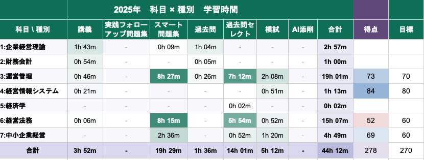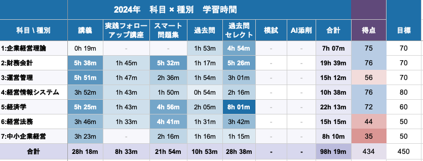 前年の一次試験後から翌年の一次試験までで期間集計しているので、少しだけ企業経営理論と財務会計が入ってますが、それは二次試験用に勉強した時間です。それを抜くとざっと40時間くらいですかね。